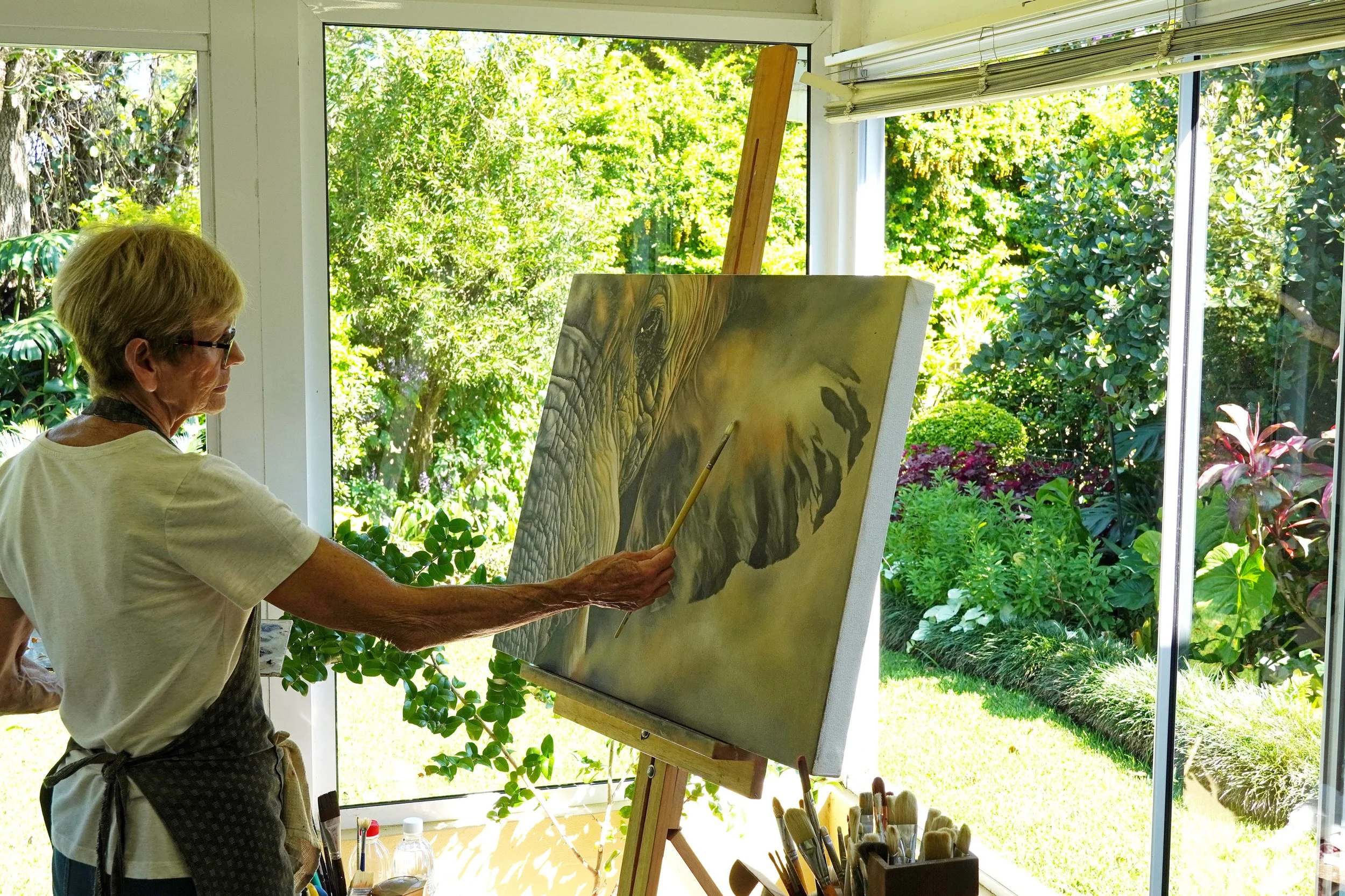 Linda lived in Zimbabwe during the bush war, staying in remote areas without electricity or running water. The wildlife around her—lions calling at night, elephants passing through—deepened her connection to the land and reignited her passion for painting